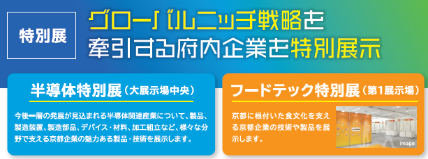 第27回を迎える今回は、「グローバル市場を勝ち抜く京都企業」をテーマに「京都発・グローバルニッチ戦略展」と新たな名前を冠して開催。高度な加工技術や製品開発力、生産性向上等の取組など、京都企業の魅力を発信するとともに、積極的なビジネスマッチングを推進します。 ・半導体特別展(大展示場中央) ・フードテック特別展(第1展示場) ・京都ものづくり展 ・産学連携展示 |