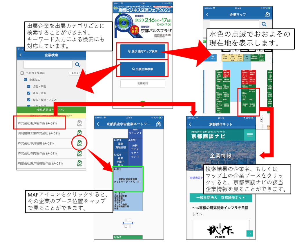 京都ビジネス交流フェアの会場において、大展示場内の出展企業のブース位置や詳細を確認できるスマホマップアプリです。